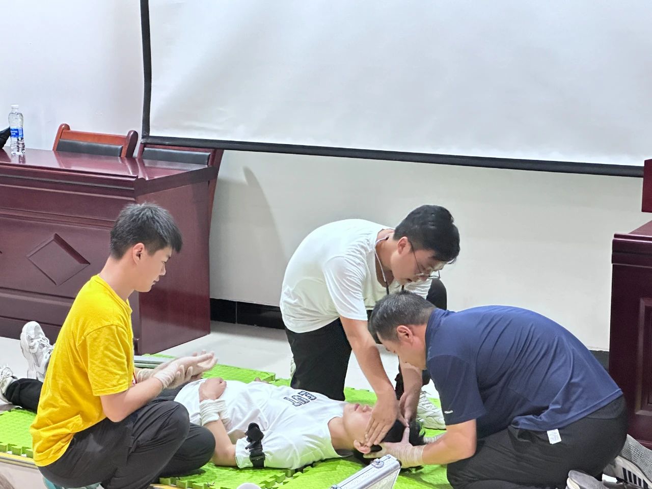 此次培训活动采用理论知识讲解和实践操作相结合的方式进行。张铁山利用多媒体资源,结合军训中可能出现的突发状况,对心肺复苏(CPR)、自动体外除颤器(AED)和伤口包扎等急救技能进行细致讲解。实操中,张铁山为助教们详细讲解了现场急救中“黄金四分钟”的意义,重点围绕如何掌握基本心肺复苏技术的操作要点及注意事项,通过对“模拟人”实施心肺复苏抢救操作进行了同步演示,包括环境评估、判断是否丧失意识、判断有无自主呼吸、判断有无脉搏、进行胸外心脏按压、开放气道等操作要领的示范,使军训助教更直观地近距离观察和学习,全体军训助教认真观看并积极参与互动,进一步将理论知识内化为可操作的行动。