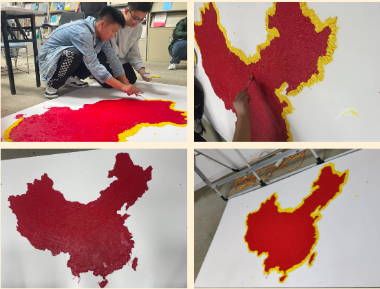 点染中国红,炽热中国心,最美中国图。颜料水彩淌过画板,光影与笑颜映衬画板。在大家的共同努力下,活动圆满结束!让我们一起欣赏一下我们美丽的祖国疆土吧!