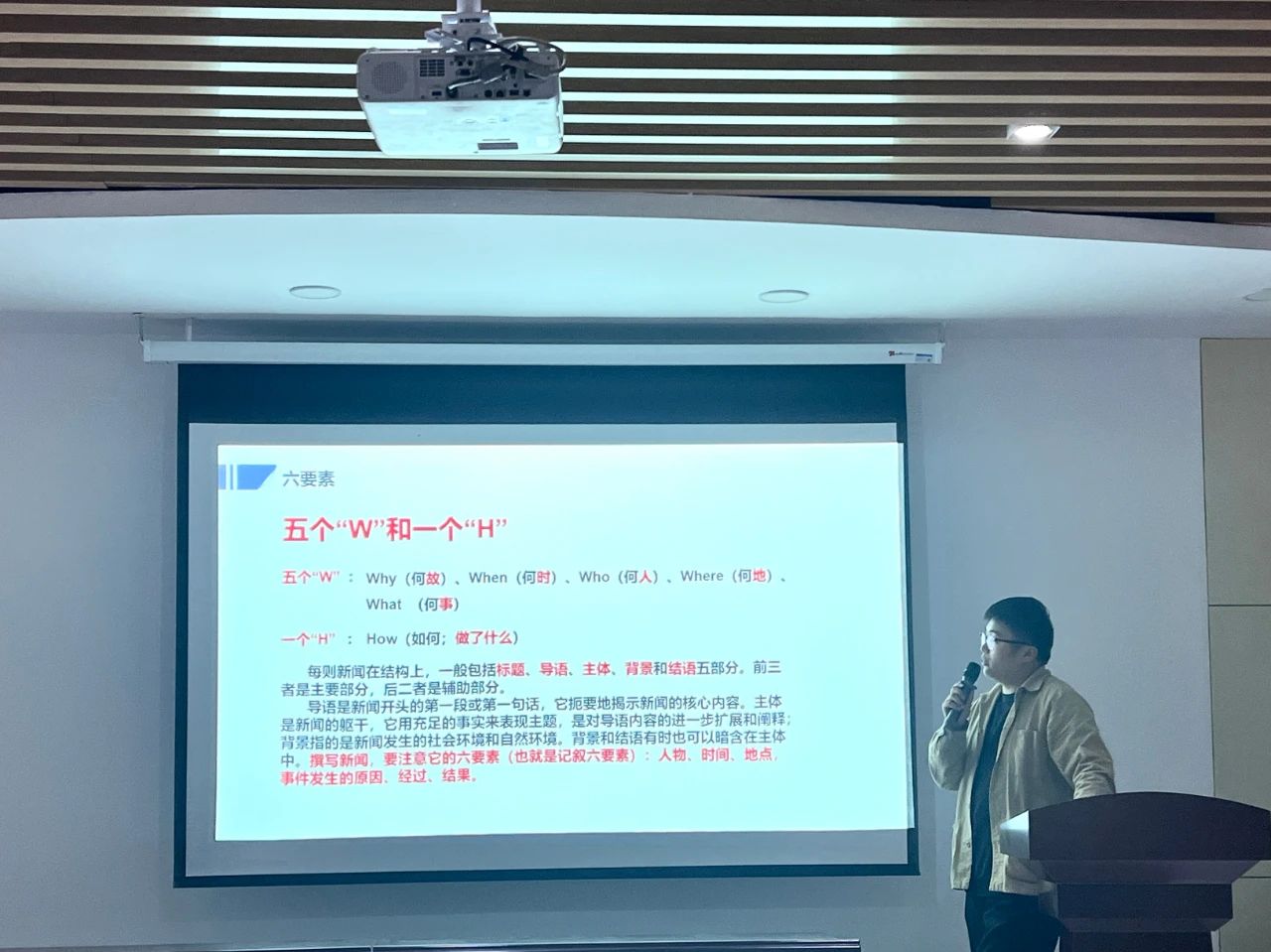 讲座伊始,朱恒江系统地向大家讲述了新闻稿的格式,以“三段式新闻”为例,简洁明了地让大家们了解新闻写作方法。他结合公司公众号的新闻片段,生动形象地讲述了新闻分段所需要的条件,让大家对新闻稿的格式有了清晰的认识。随后,他通过宣讲活动、专题分享会、专题讲座、个人会议四个框架讲解了不同类型新闻稿的要求,细致地将新闻中常用到的语句模板一一进行讲解。整个培训会由浅到深,让参会干事清晰了解到新闻稿的书写格式及规范。最后,朱恒江以讲解新闻中所要注意的问题结尾,对参会干事们提出殷切期望。