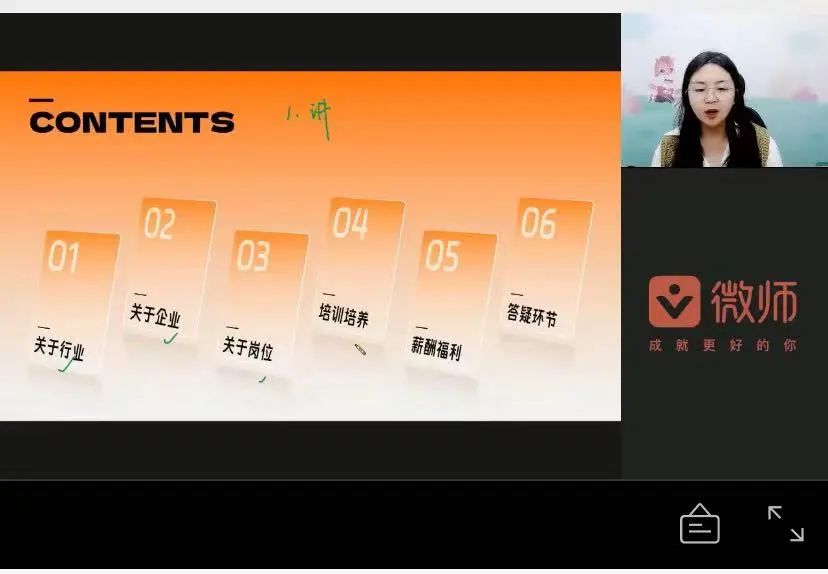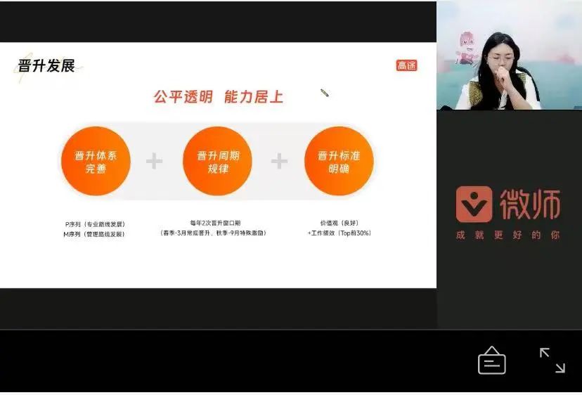 会议伊始,陈旋详细讲解了高途的创立、发展史、公司规模等基本信息,并提到高途具备良好的文化氛围,包括使命、愿景、价值观、教育理念等,好的文化促进高途高质量发展,也激发员工奋发向上的精神面貌它兼具教育基因和科技驱动力,覆盖了一系列教育培训与留学、学习服务,也为广大客户提供了长周期的学习服务。随后,陈旋通过行业、岗位、培养,薪资等方面向大家详细介绍了岗位的选择方向与面试培养的内容,利用数据分析展现高途学习的风采,不仅拓展了选择的多样性,而且提高了直播间听众们积极的兴趣。增强大家在选择喜欢岗位中的热情。随后,参与线上宣讲会的同学在讨论区提出问题,主讲人耐心地为大家解答,并告知大家秋招的流程和面试时间。她希望有意向的同学可以多多尝试,主动抓住适合自己的工作机会,不留遗憾。