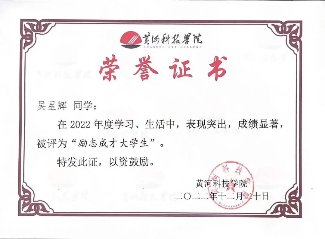 该生乐于奉献,勤学进取,时刻牢记“厚德博学 砺志图强”的黄科院校训,传承“开拓 拼搏 实干 奉献”的黄科院精神,积极参加勤工助学,在志愿活动中奉献自己的力量,累计参加社会实践志愿时长超300小时;多次参加国家级省级竞赛并获得荣誉;学习成绩优异,成绩与综测排名专业双第一,有较强的专业素养,是一名品学兼优的老员工。他既像红日般充满生机奉献自我,更如恒星般闪烁着耀眼的光芒。