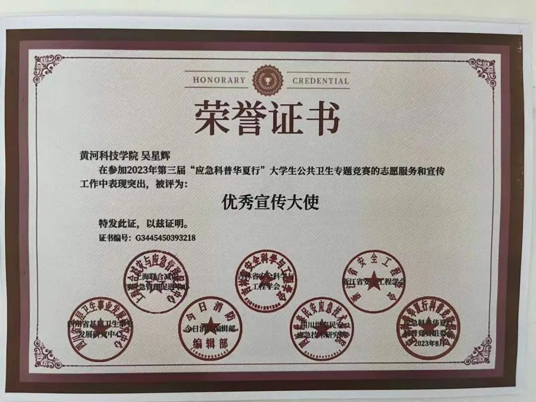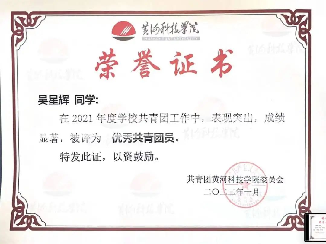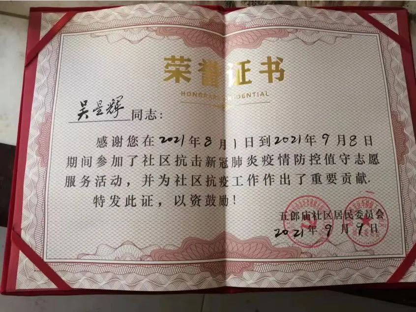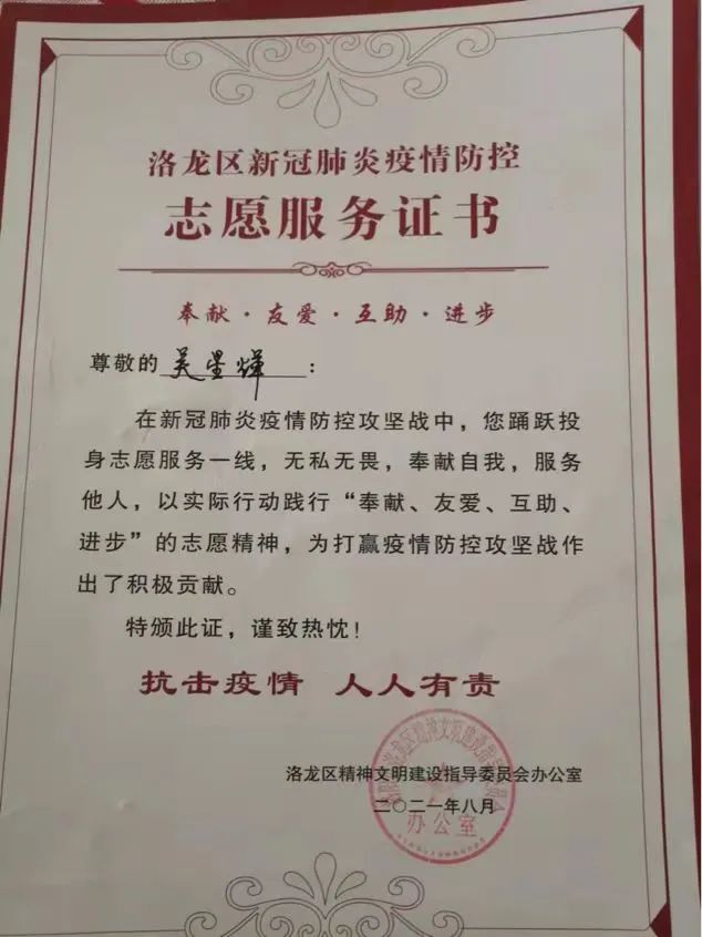 自新冠肺炎疫情爆发后,他主动请缨,积极投入抗疫一线,暑假期间与社区工作人员一同进行常态化疫情防控宣传工作,深入社区进行志愿服务岗值守,到居民区发放疫情防控宣传单,社区的抗疫环境十分艰苦,一个临时搭建的活动房,夏天近40度的高温,他不畏艰苦和其他志愿者一同坚守。这段期间不仅磨练了他的心智更让他坚定了入党时的那份初心,同时也得到了社区以及政府的嘉奖,授予该生“洛龙区优秀志愿者”的荣誉。