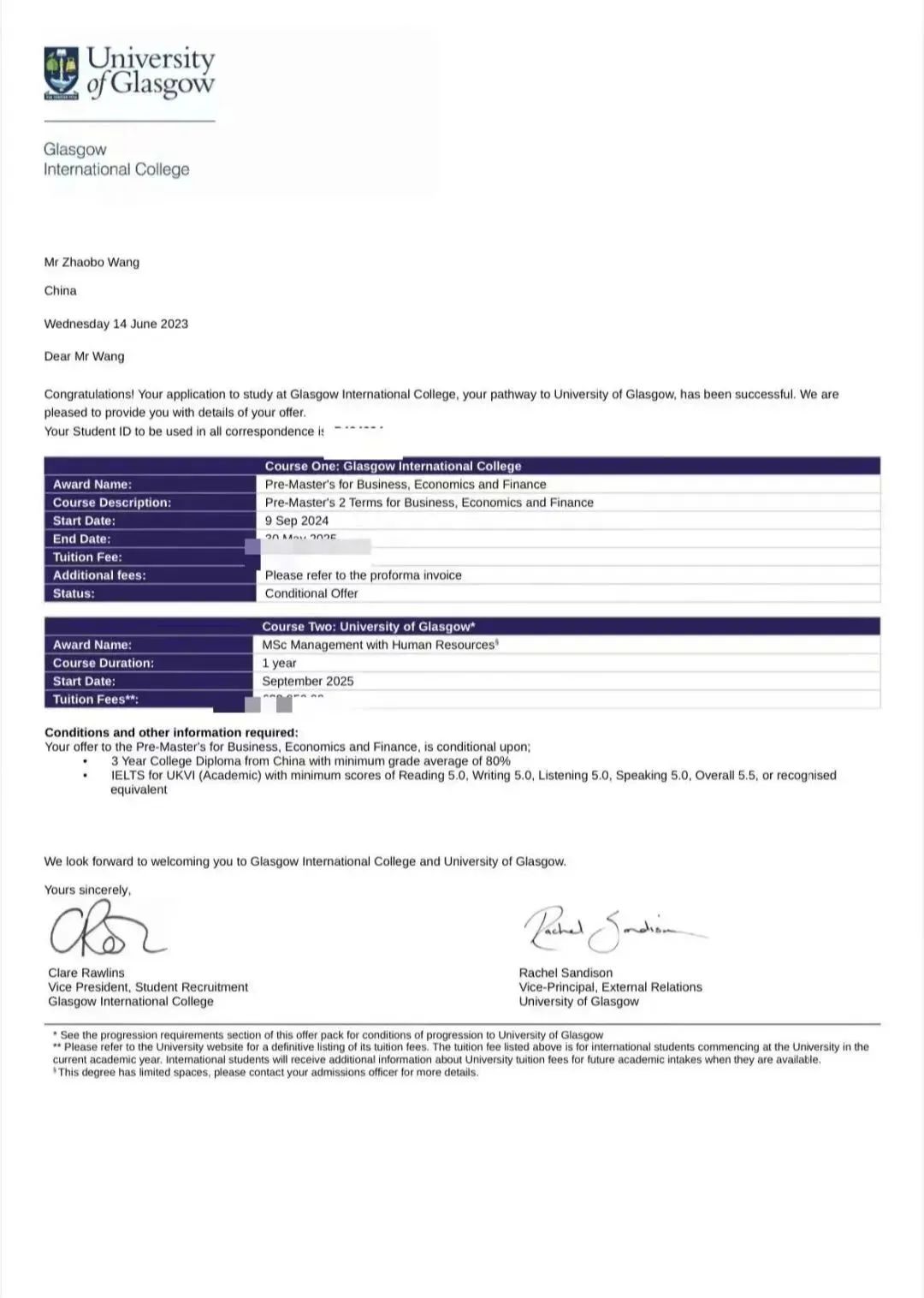 王兆博,2021年入读beats365唯一官网电子商务专业,专科。被英国格拉斯哥大学会计人力资源管理专业录取为硕士研究生,2024年9月入学到2026年9月毕业。