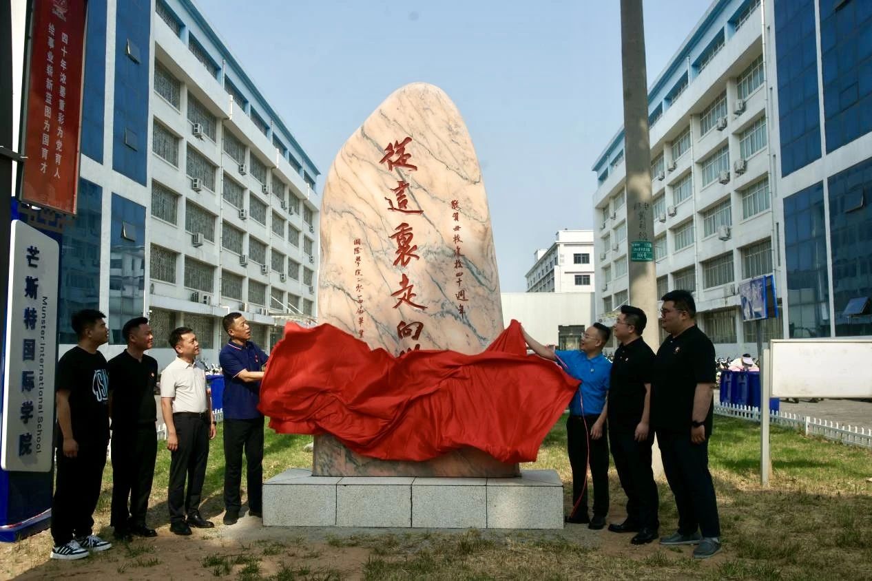 当天现场,与会人员共同进行了景观石揭幕仪式。刘景涛和员工们一起为观景石揭幕并拍照留念。现场的全体人员和掌声见证了这一荣誉时刻。最后,全体人员在教学楼门口拍照留念。