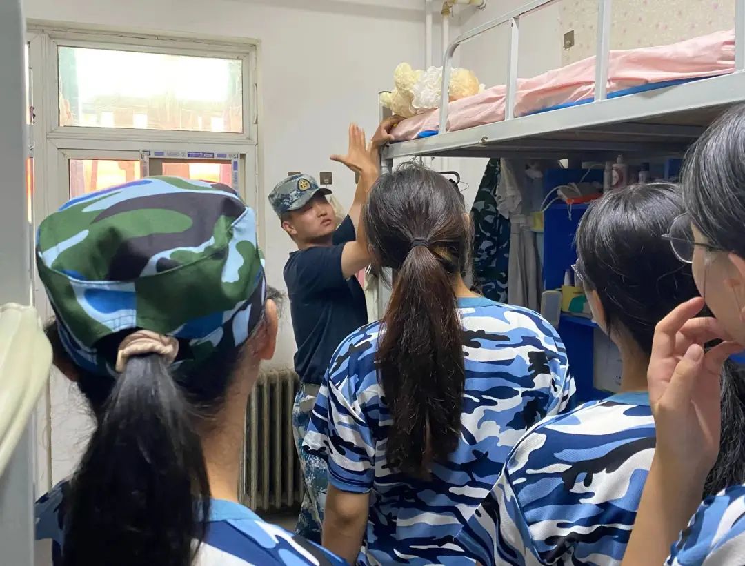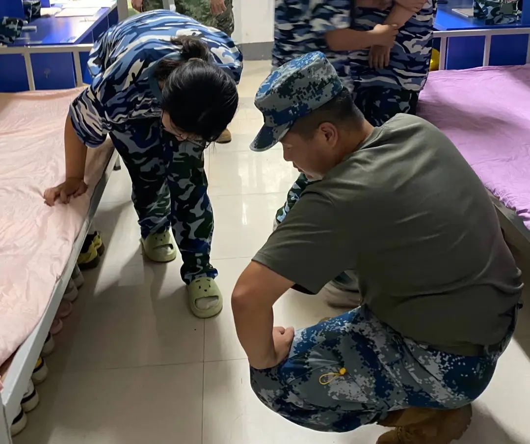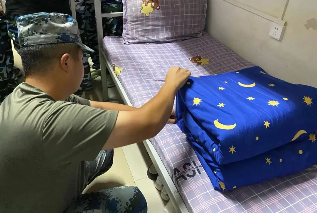 “出门看队伍,进门看内务。”训练场上磨练精神,内务整理彰显态度,同学们在教官的指导下学习如何叠出完美的“豆腐块”,为养成良好的生活习惯打下坚实的基础。