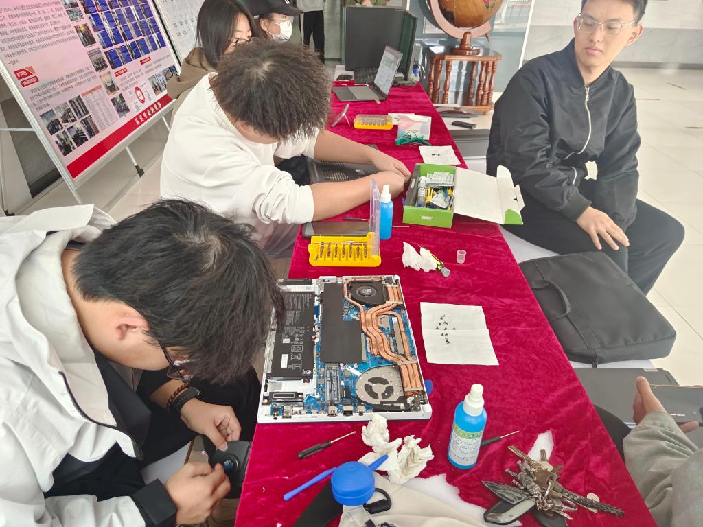 在当今科技飞速发展的时代,电子产品已成为生活不可或缺的一部分。但在日常使用当中,难免会出现故障。在行政办老师杨喜元的带领下,社长逵宇航与副社长陈世博、李君豪、高逸飞相互协调面对同学们的到来积极上前进行电子器械的维修和检查,并带领新成员们乐此不疲的进行服务。部门成员积极上前进行电子器械的维修,负责维修的主力部员面对前来寻求帮助的师生进行细致的排查、拆卸和重组。一个个认真工作的身影展现了电子维修社为师生提供力所能及帮助的责任感。同时,面对同学们对维修方面提出的问题,学社的成员也耐心地解答和帮助,这使得部分师生解决了一些难题。