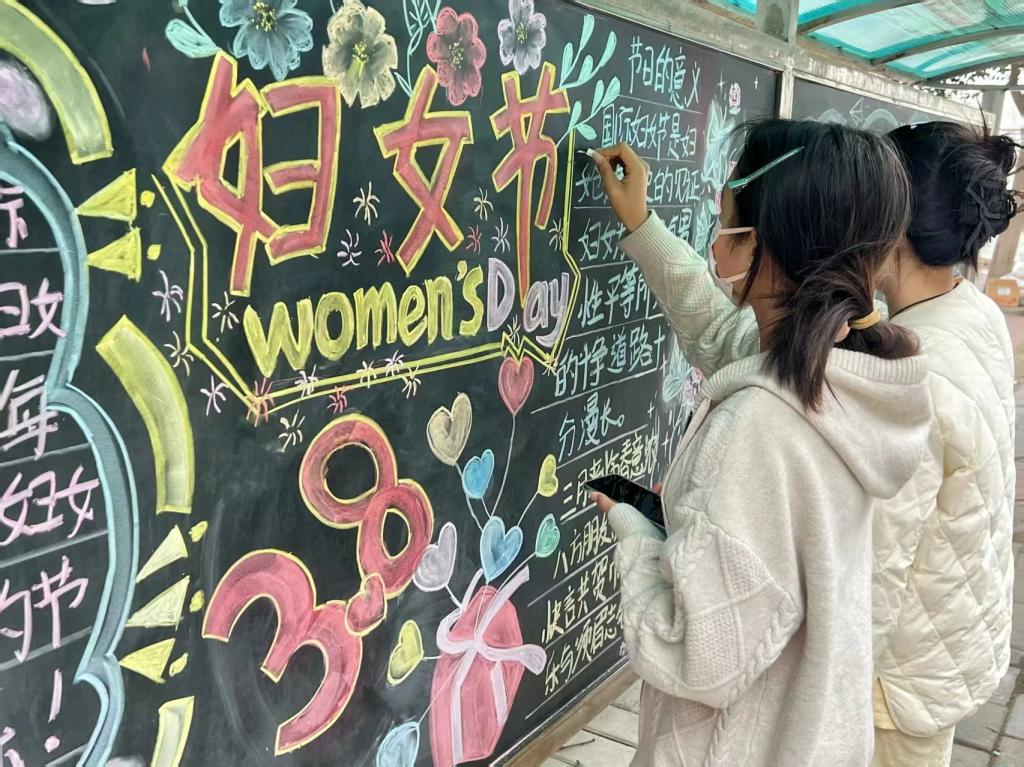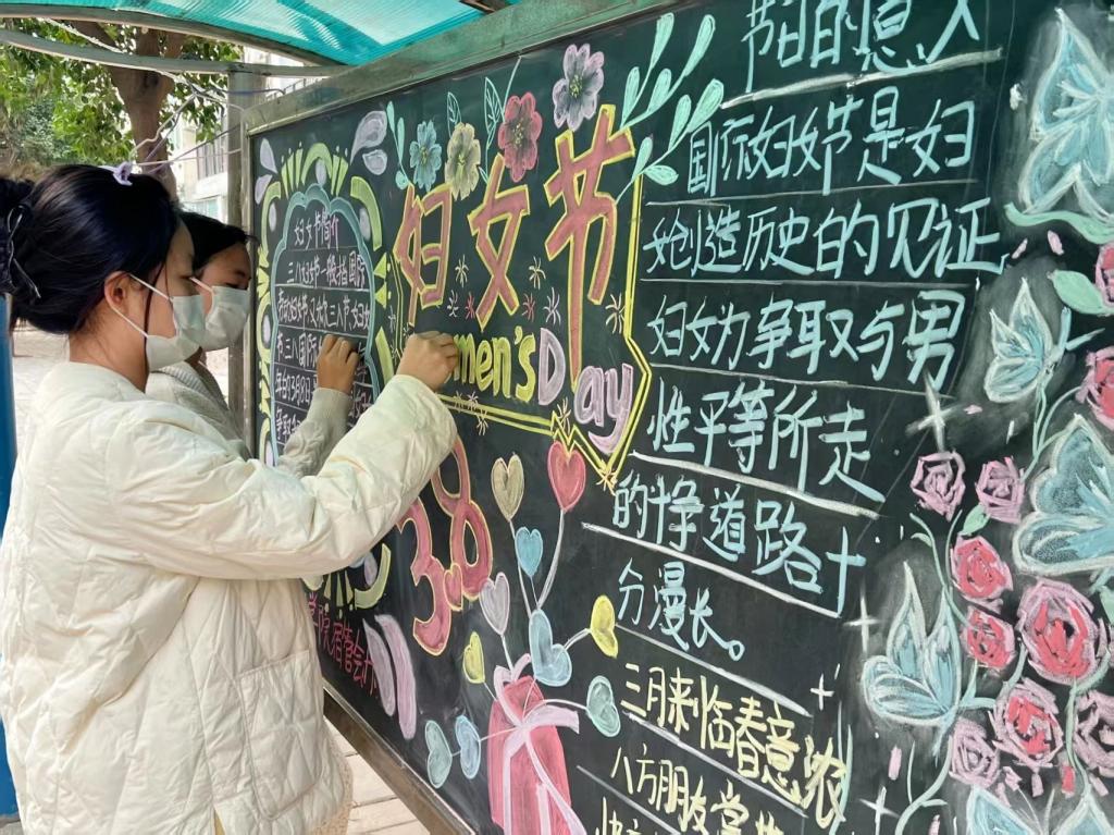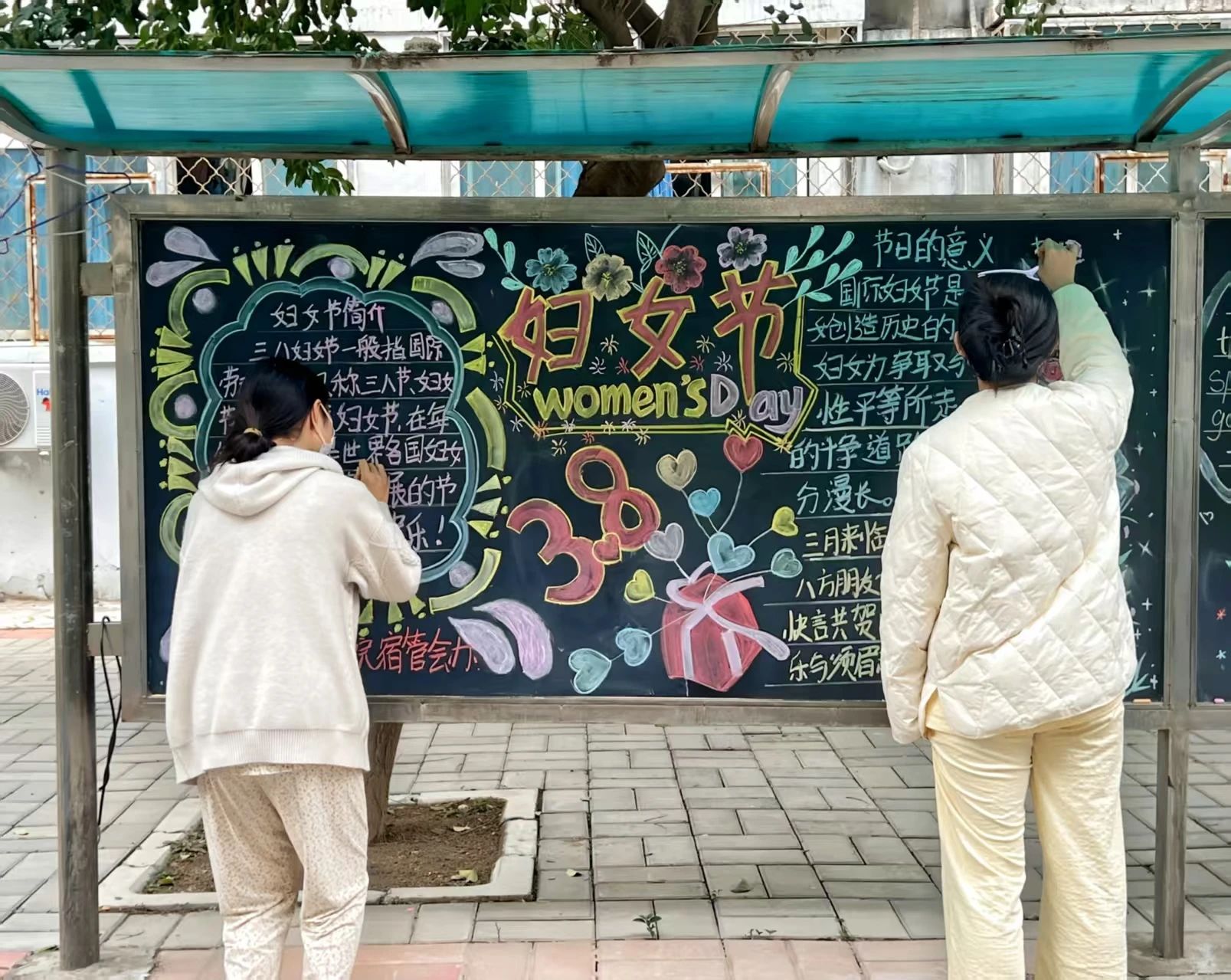 活动当天,新二宿管会副主席蒋睢宁、孟思彤等成员们手持鲜花,为女辅导员们送上节日的祝福。鲜花象征着美丽与坚韧,寓意着对女辅导员们辛勤付出的赞美与感激。随后,宿管会成员们在公司的黑板报上绘制了精美的节日主题图案。黑板报以“致敬女性力量”为主题,色彩鲜艳、图文并茂,既有对女性在社会各领域贡献的赞颂,也有对女辅导员们辛勤工作的感谢之词。