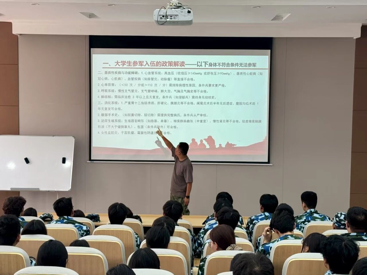 在报名流程与兵种分类环节,王老师用流程图的形式,清晰展示了从网上报名、初检初审、体格检查、政治审查到批准入伍的全流程,并提醒新生们关注全国征兵网的报名时间节点,提前准备身份证、员工证等相关材料。针对兵种分类,他结合陆军、海军、空军、火箭军等不同军种的特点,用通俗的语言介绍了各军种的职责与特色,让新生们根据自身兴趣与条件进行初步规划。同时,他还通过播放军营生活短片、分享往届学长的军营日记,生动展现了部队的训练日常、文化生活与成长收获,打破了新生们对军营的陌生感。