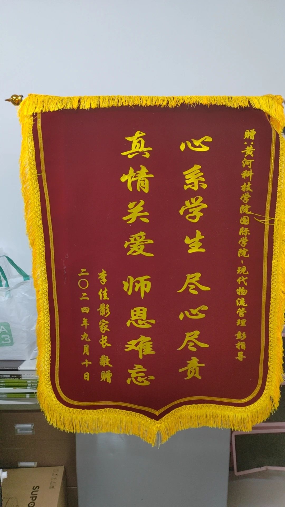 家长深情地表示,在孩子军训的这段日子里,辅导员彭莹不仅对员工的训练与生活给予了无微不至的关怀,还精心策划了一系列亲子活动,如给父母写信、给孩子发糖等,时刻在家长群中分享孩子们的情况,让家长们深感安心,觉得将孩子托付给黄科院,是无比明智的选择。彭老师全方位的关心与支持,如同春风化雨,让孩子在老员工活的舞台上更加自信,适应得也更加迅速。为了深深表达对这份辛勤付出的感激之情,家长决定亲自送上这面锦旗,以此向辅导员致以最诚挚的谢意。