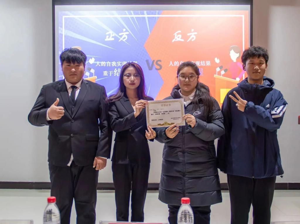 首先,底凯茵点出本次辩论赛主题“自我实现的过程重于结果,还是自我实现的结果重要过程”,由双方辩手进行开篇立论,双方引经据典就论题展开了激烈的辩论,双方选手的慷慨陈词赢得在座观众一阵喝彩。随后,在自由辩论过程中双方出口成章,口若悬河的表现展示了丰富而又扎实的知识储备。各位辩手在认真倾听对手的发言,从中寻找发掘点,一针见血的提出反驳观点同时通过各种事例论证己方的观点。正方选手以一句“谋事在人,成事在天”,“谋事即为过程,成事即为结果,在明白成事不是由人注定的时候,要更注重在成事过程中的收获”作为开端,反方紧随其后,以“正是无数个我们经历过的大大小小的结果造就了今天的我们。”,将整个辩论环节引入高潮。在总结陈词环节中正反双方辩手清晰的思路与精简的陈词都给观众们留下了深刻的印象,双方辩手挥斥方遒的身姿赢得了观众们的认可,所谓“胜败乃兵家常事”。在各位评委对本次比赛进行精辟的点评后,现场响起经久不绝的掌声。双方辩手也分别获得了属于自己的荣誉。获得本场最后胜利的是反方辩手,获得本场最佳辩手的是二大队现代物流专业何林洁。现场评委给优胜参赛队伍及最佳辩手代表何林洁颁奖合影留念。最后,柴肖阳做出最后的总结,对于各位参赛选手的努力作出了肯定,并对他们的勇气和智慧加以赞扬,鼓励青年突击队积极分子积极参与今后的活动,舞动青春,展示风彩。本场辩论赛就此圆满落下帷幕。