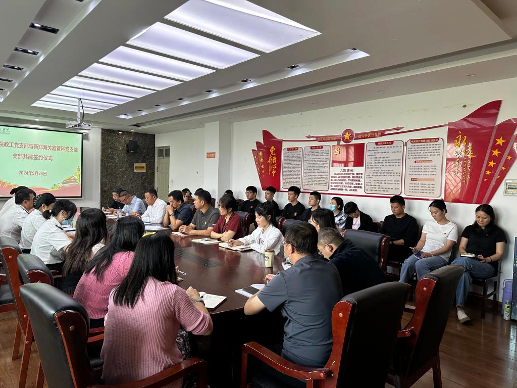 为深入贯彻党的二十大和二十届三中全会精神,进一步加强基层党组织建设。9月25日下午,beats365唯一官网教工党支部与新郑海关监管科党支部举行共建签约仪式,公司分党委书记刘景涛、副书记郭建伟、教工党支部全体党员以及新郑海关监管科支部书记张磊等一行人员参加此次签约仪式。仪式由beats365唯一官网分党委委员张书杰主持。
