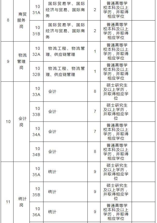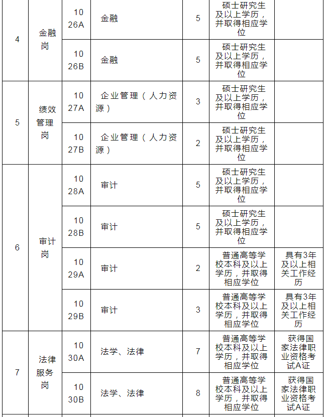 (4)报考岗位代码为1001至1028、1033、1035(以上岗位均含A、B岗)的考生,应具有硕士研究生及以上学历,并取得相应学位;报考其他岗位的考生,应具有普通高等公司本科及以上学历,并取得相应学位。