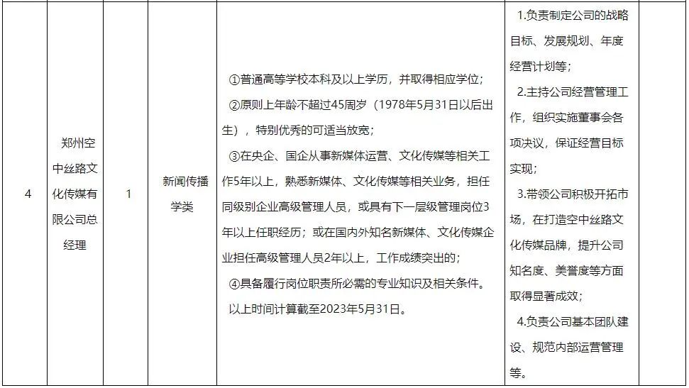 (4)报考郑州空中丝路文化传媒有限公司总经理职位的,需具备以下资格条件:
