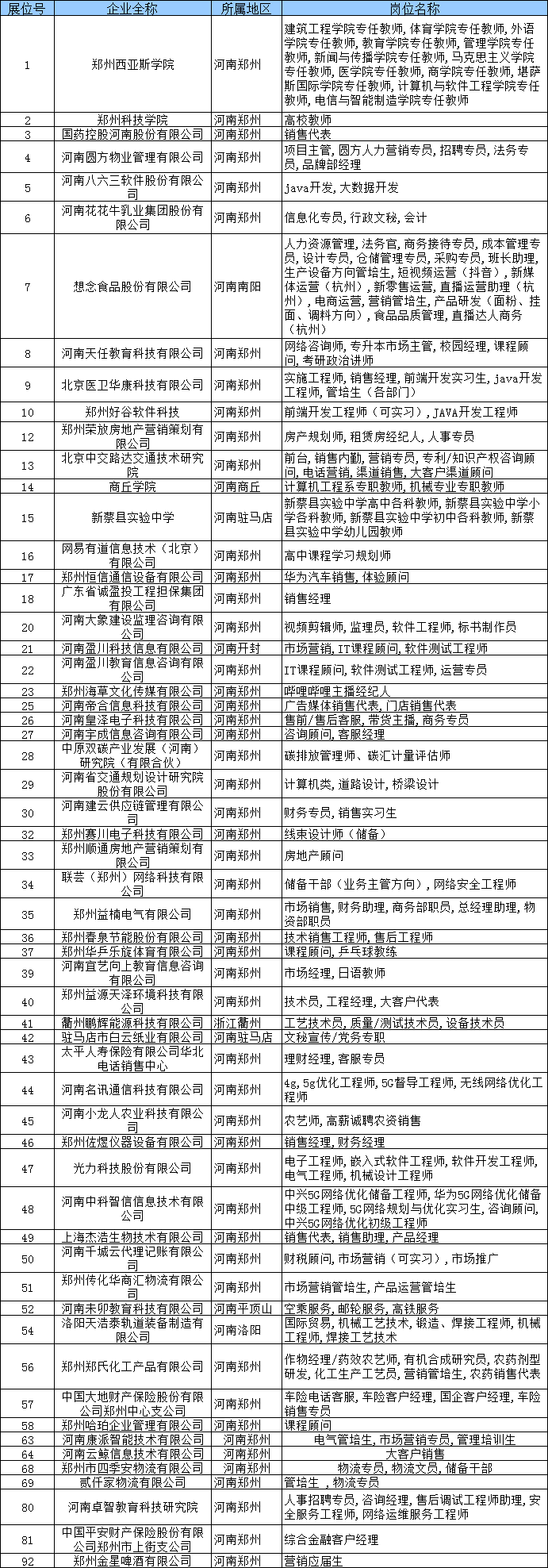 截至目前,郑州西亚斯公司、郑州科技公司、商丘公司、新蔡县实验中学、河南省交通规划设计研究院、国药控股河南股份有限公司、河南花花牛乳业集团股份有限公司、驻马店市白云纸业有限公司、想念食品股份有限公司、河南八六三软件股份有限公司、郑州郑氏化工产品有限公司、河南圆方物业管理有限公司等60余家高等院校、国有企业、上市公司、知名企业报名参会,提供岗位5000余个,用人单位持续报名中......