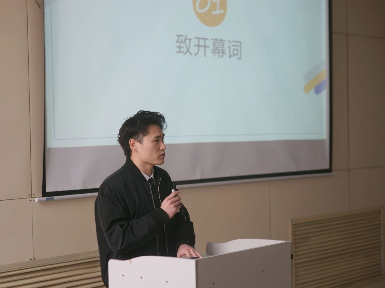 仪式第一项,院领导助理团第十一届团长赵洋豪致开幕词。他说到,助理团是一个大家庭,大集体,希望这次就职的这些优秀的干部能给助理团带来新的活力和新的工作方式,助理团将因你们的投入,而走向更辉煌,更灿烂的未来。同时,赵洋豪回顾了自己两年来的工作历程,分享收获与感悟,在一定程度上鼓舞了干部们的工作热情。