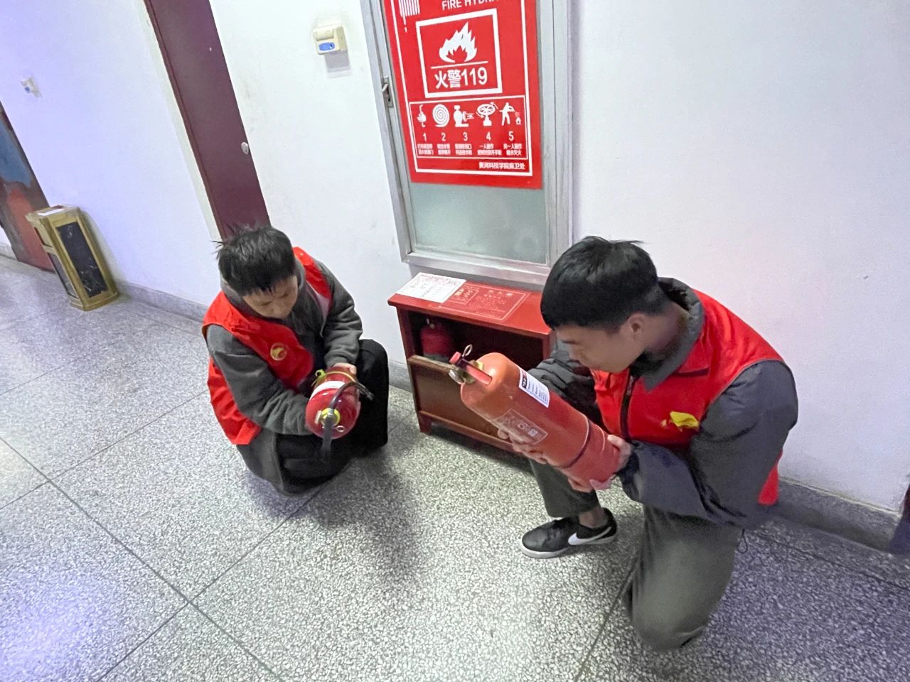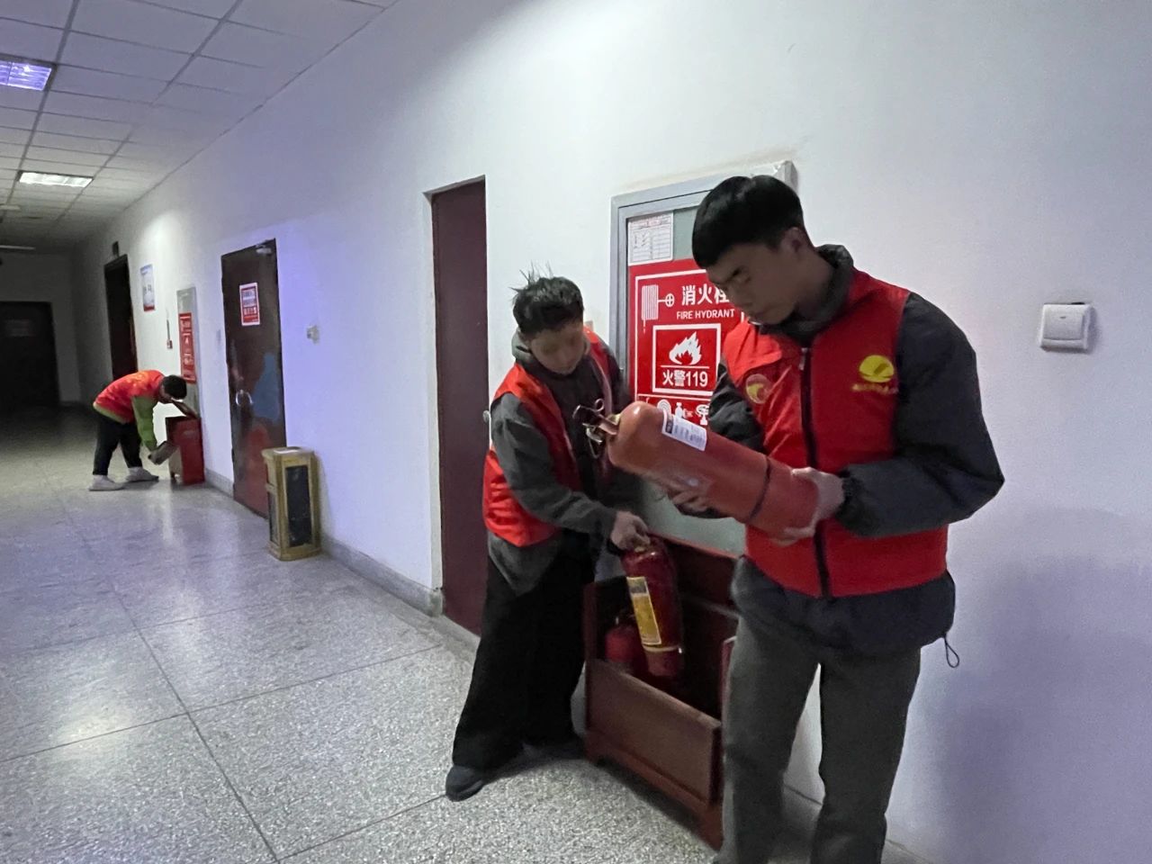 小团子们对教学楼的消防器械进行检查和保养