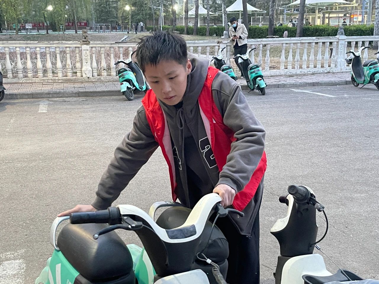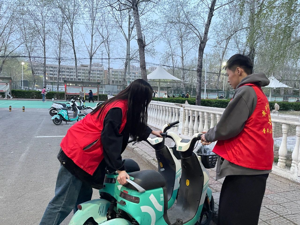 小团子们在信息大楼摆放乱停的共享单车