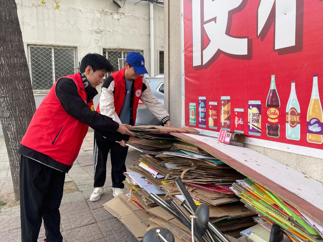 小团子们帮助公司保洁人员进行可回收物品整理