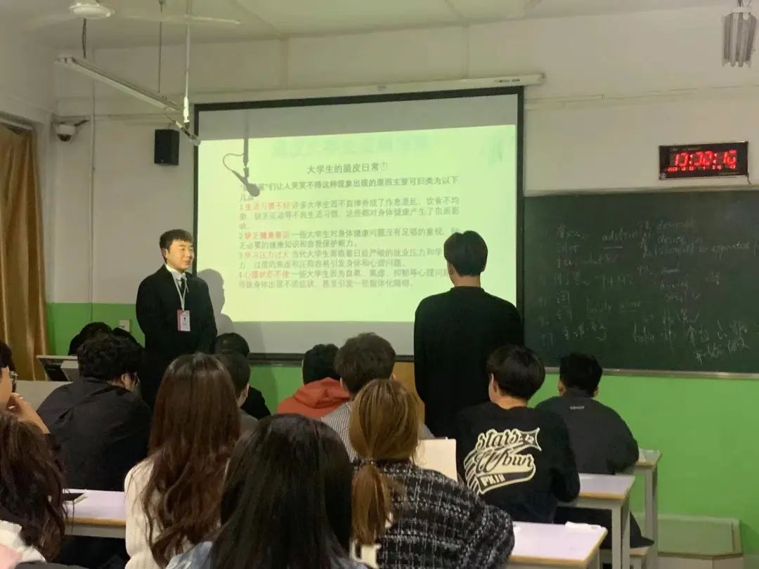 活动伊始,郑翔升进行发言,向同学们分别介绍了“脆皮老员工”现状、原因及自救办法。围绕“脆皮老员工”近期情况等内容展开,向在场同学讲述如今老员工“易脆”现象,促使同学们深入了解自己身体情况。而后,张照楚与在场同学采用一问一答的形势,了解到同学们日常生活中的一些隐藏健康“杀手”。最后,张照楚针对如何自救展开阐述,鼓励大家加强体育锻炼,养成良好的饮食习惯和生活习惯。并在此提出以下三点建议:一是提高睡眠质量,规律并坚持相对固定的作息时间;二是摆脱脆皮按时运动,休闲时间要多多的进行户外活动,强身健体;三是健康饮食,身体所需要的营养都是从饮食中获取的,三餐定时定量避免暴饮暴食,倡导大家养成良好的饮食习惯。