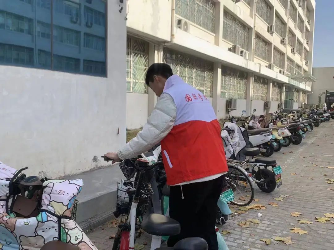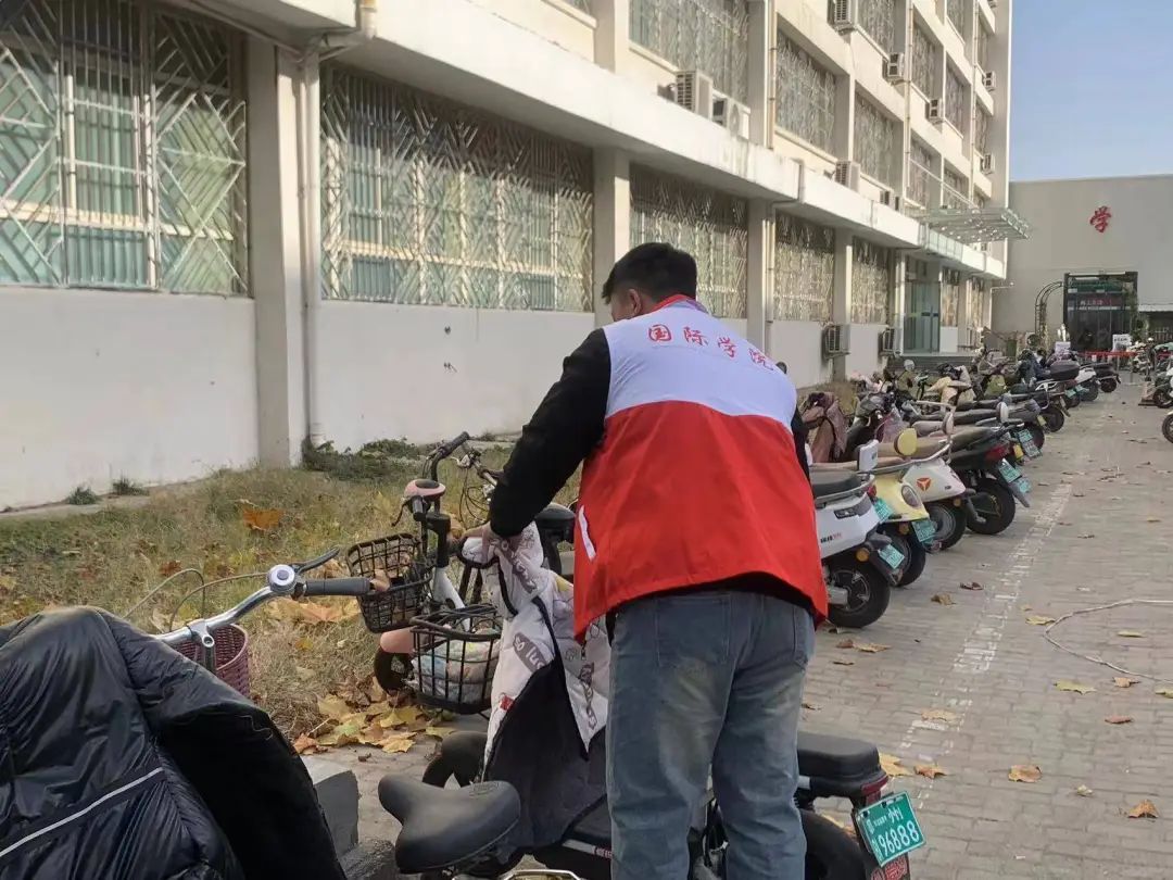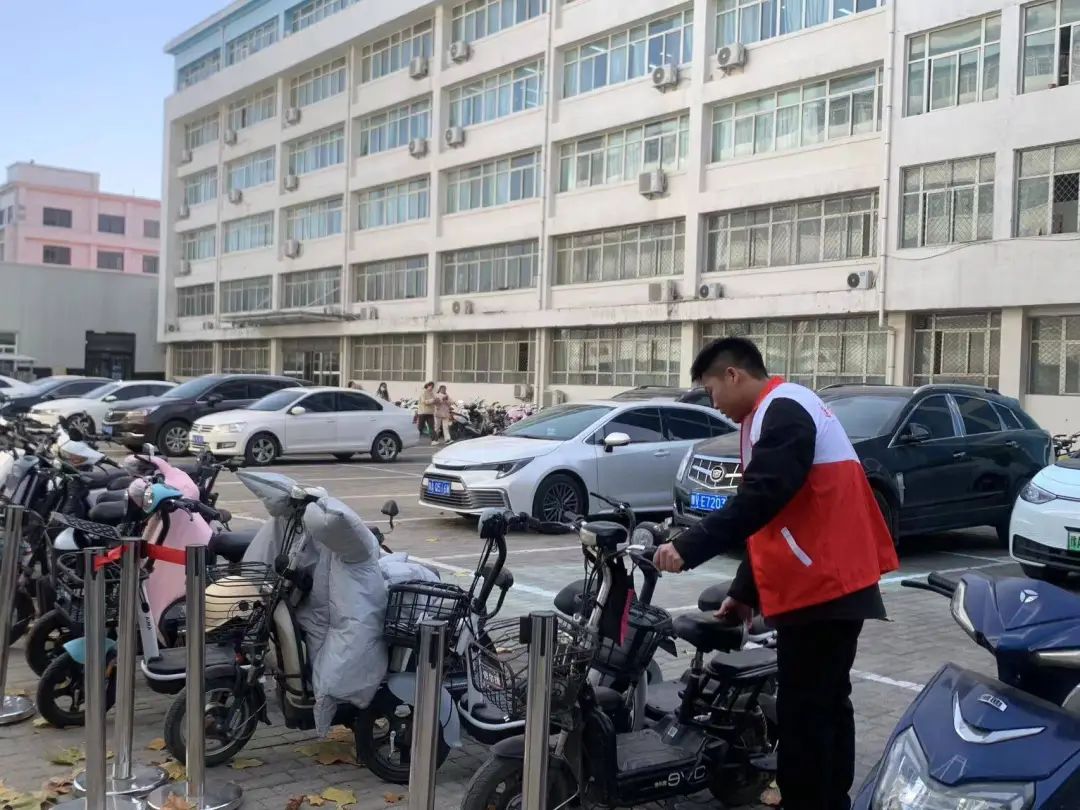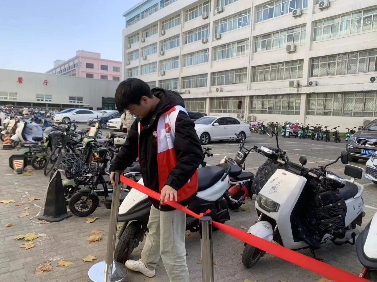 车辆有序停放,你我出行通畅。”此次活动中,志愿者们分工明确、认真负责,把未按要求停放的电动车整齐摆放在规定停车区域。同时,志愿者指引员工把电动车停到指定位置,对停车不规范的行为进行制止和劝导,并向其说明不规范停车的危害,在同学们的共同努力下,道路面貌焕然一新,整齐划一的车辆成为了校园内一道靓丽的风景线。