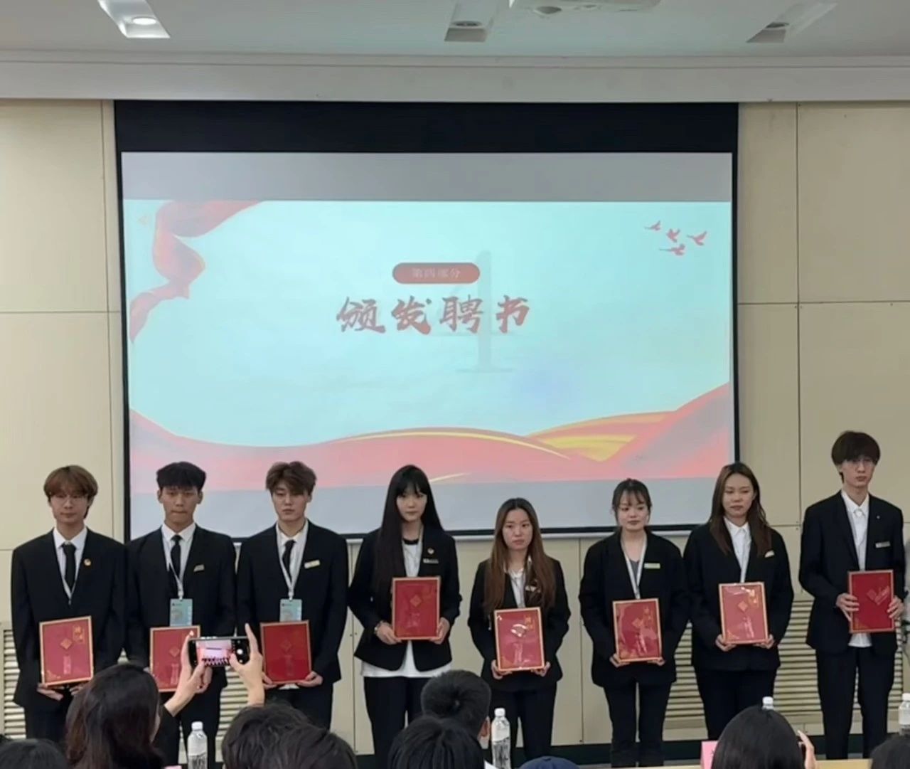 会议伊始,闫怡彤和于水源带领全体成员合唱团歌,在大家整齐嘹亮的歌声中,会议正式开始,由郑锃豪宣布对各部门部长任职决定,田嘉辉和郑怡琳为各部门部长颁发聘书并合影留念。郑锃豪表示,这是团组织的传统与精神传承,期望在新阶段开拓创新,激发团队潜力,推动公司团学工作上新台阶。随后,田嘉辉强调团委工作重要性,让干事们了解规章制度、纪律,鼓励各位干事积极工作、向团组织学习靠拢。接着,各部门部长及干事进行才艺展示,带动全场气氛。四个部门部长代表也分别上台发言,总结过去工作并规划新学期工作方向。最后,团委全体成员合影留念,大会圆满落幕。