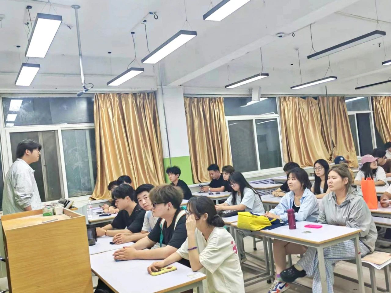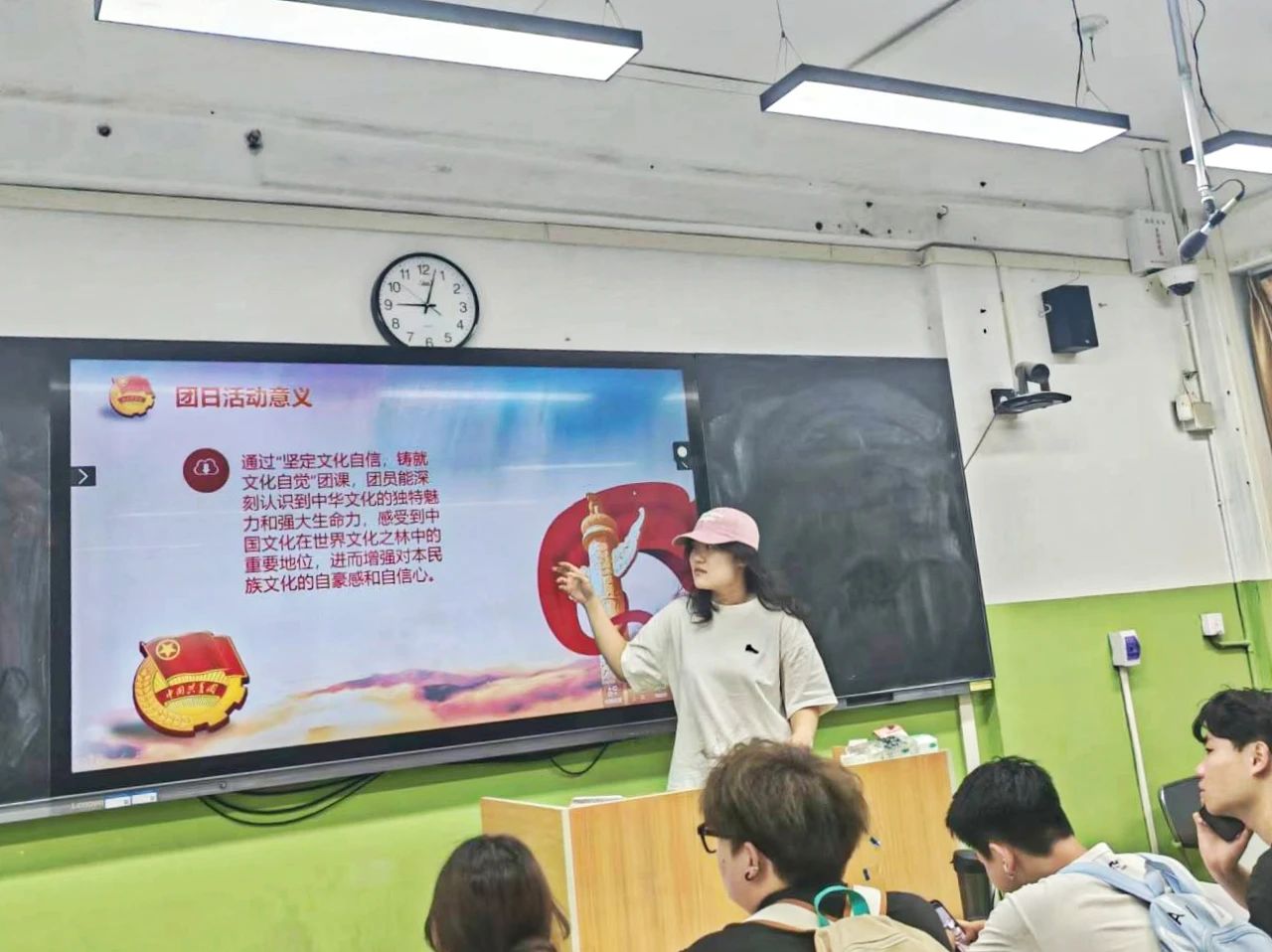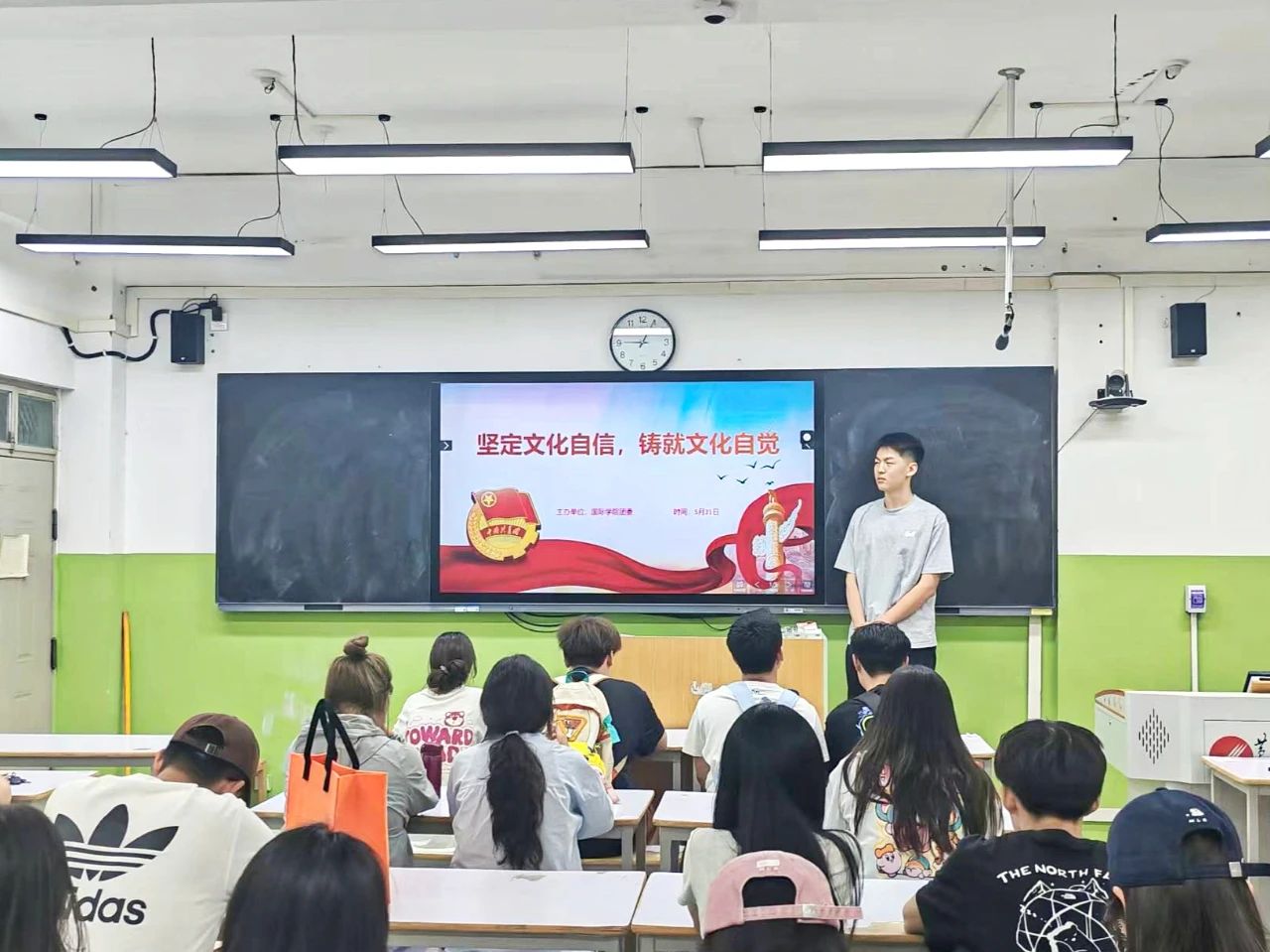 活动伊始,团支书代表柴淼楠发言,她强调文化自信是民族发展持久动力,文化自觉是对文化的认知与担当。优秀传统文化、革命文化、社会主义先进文化筑牢精神根基,坚定自信、强化自觉,方能激发文化活力。紧接着,现场提问环节,气氛持续升温。同学们结合实际踊跃举手,聚焦在国际交流中更好地展现中国文化特色、怎样平衡多元文化学习与本土文化传承等问题展开提问。有同学以《典籍里的中国》《国家宝藏》等爆款文化节目为例,探讨新时代文化传播的创新路径;也有同学针对"青年群体对传统文化兴趣不足"的现状发起讨论。创新性提出打造"沉浸式文化体验日""中英双语文化剧本杀"等活动方案。柴淼楠在解答中指出在多元文化相互激荡的当下,青年一代作为文化传承的主力军,必须保持清醒的头脑,深入挖掘文化内涵,让优秀文化在新时代焕发全新活力,通过分享传统美食制作、解读节日文化内涵等方式,以小见大,让人真切感受中国文化的独特魅力,推动中华优秀传统文化、革命文化与社会主义先进文化焕发的时代光彩。互动问答不仅加深了同学们对文化自信与文化自觉的理解,更为文化传承创新提供了新思路。也为大家提供了许多实用的文化传播经验。最后,全体成员起立,以共同演唱《我和我的祖国》圆满结束。