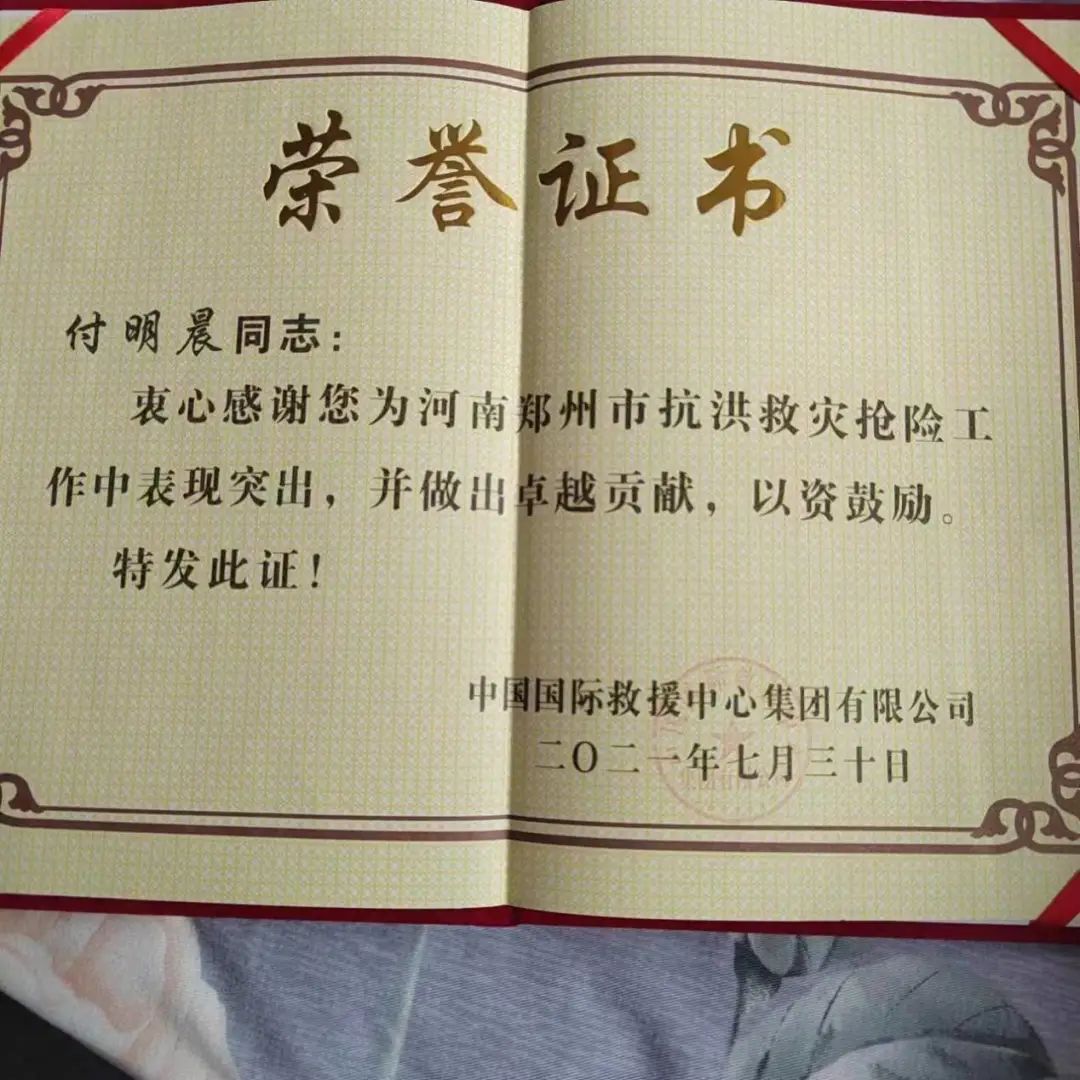 汛情就是命令,责任重于泰山。去年夏天在郑州市发生严重内涝的危急时刻,当时还是一名高三员工的付明晨,在网上看到内涝的消息后立即联系国际救援组织报名参加抗洪志愿者工作,投身于抗洪志愿工作,为灾情支援效力,履行了作为一名共青团员应尽的义务,彰显了一名员工乐于服务社会的奉献精神。付明晨同学经过组织的就近分配,立即投入了志愿工作,道路清淤、清扫路障、搬运物资、安抚群众情绪,进行信息登记,他努力践行志愿者精神,恪守职责,认真完成每一项工作。