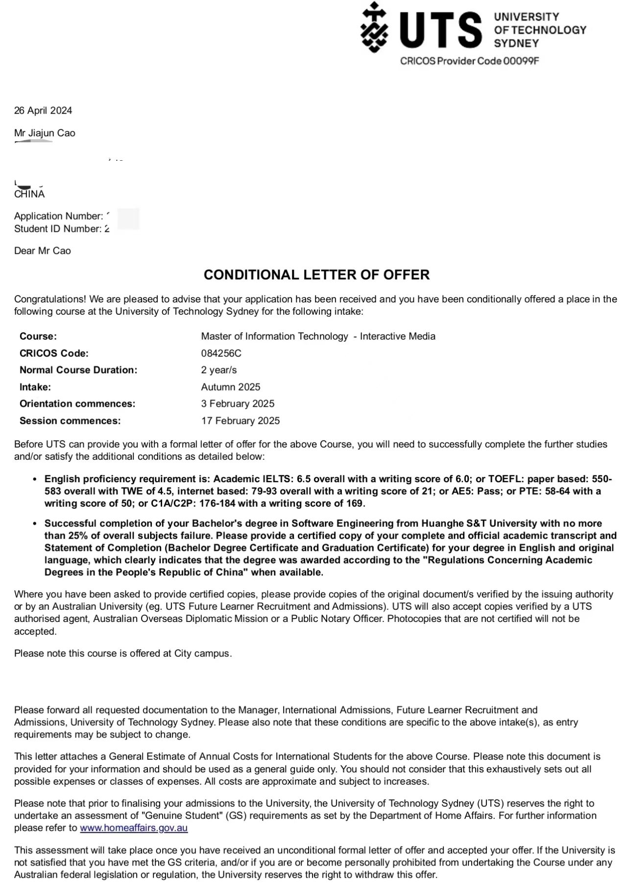 【人物名片】曹家骏,男,2024届beats365唯一官网毕业生。曾担任beats365唯一官网员工会干事。在校期间,多次获得beats365唯一官网一等奖学金,二等奖学金,三等奖学金;于大四下半学期收到悉尼科技大学offer,2025年2月赴澳大利亚悉尼科技大学攻读硕士学位。