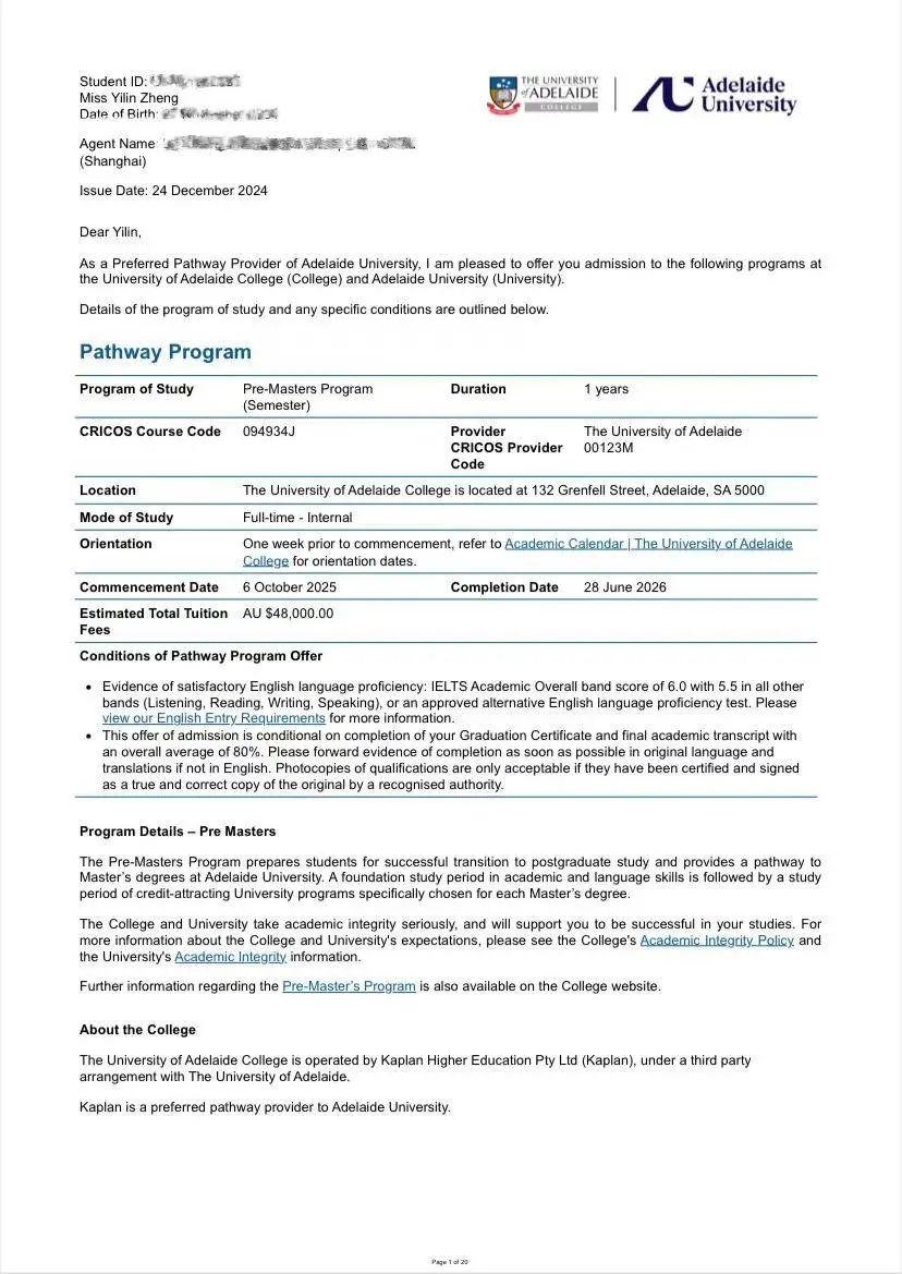 申请国外院校的过程繁琐漫长,郑怡琳在老师指导下,精心准备材料,经过不懈努力,她成功收获澳洲阿德莱德大学offer。郑怡琳建议准备留学的同学:注重英语能力和绩点提升,积极参与竞赛和实践活动,丰富个人履历。合理规划时间,提前准备各项材料,为留学申请做好充分准备。